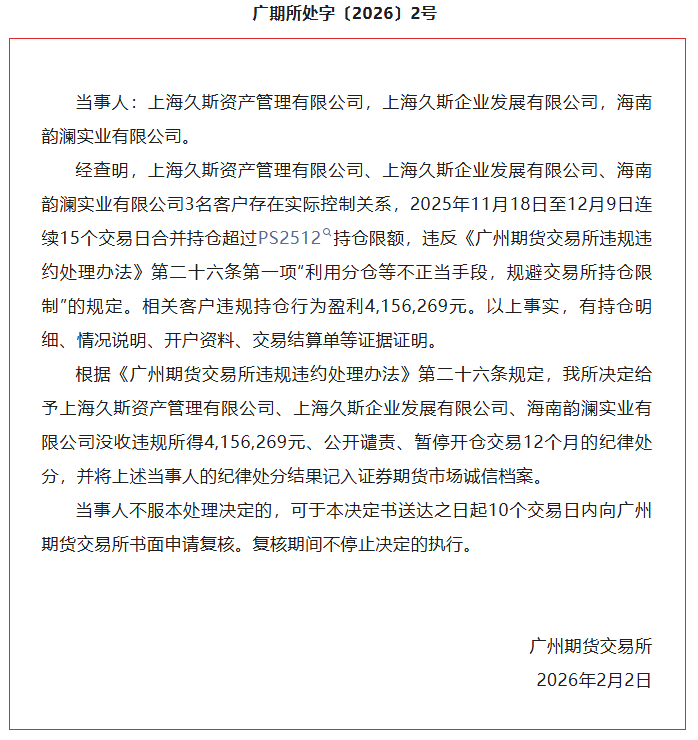 广期所处字〔2026〕2号文件显示,上海久斯资产管理有限公司、上海久斯企业发展有限公司、海南韵澜实业有限公司3名客户存在实际控制关系,2025年11月18日至12月9日连续15个交易日合并持仓超PS2512持仓限额。相关客户违规持仓行为盈利4,156,269元。