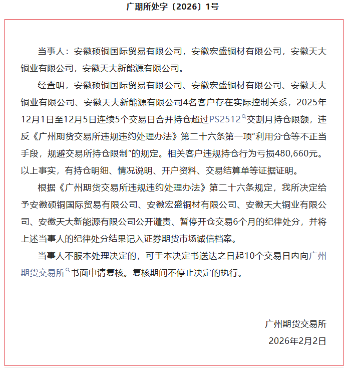 广期所处字〔2026〕1号文件显示,安徽硕铜国际贸易有限公司、安徽宏盛铜材有限公司、安徽天大铜业有限公司、安徽天大新能源有限公司4名客户存在实际控制关系,2025年12月1日至5日连续5个交易日合并持仓超PS2512交割月持仓限额。相关客户违规持仓行为亏损480,660元。
